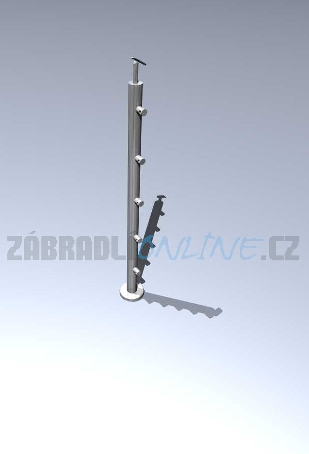Nerezový sloupek zábradlí, trubka 42,4 mm. Sloupku určený pro kotvení shora. Konstruovaný pro 5 ks nerezových výplní o pr. 12 mm a madlo libovolné velikosti. Materiál je nerez K320, jakost AISI 304. |